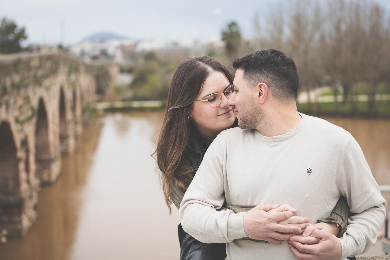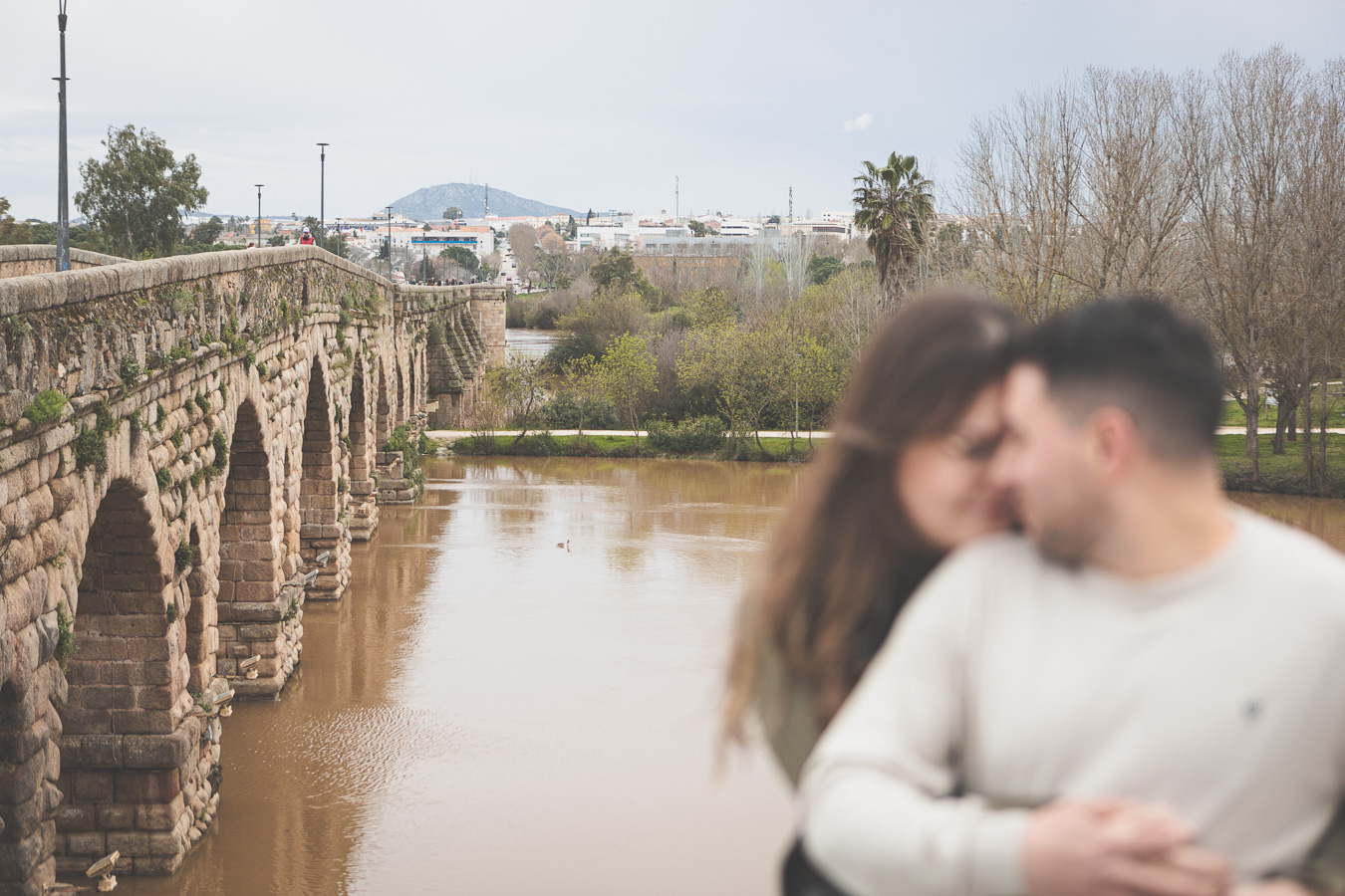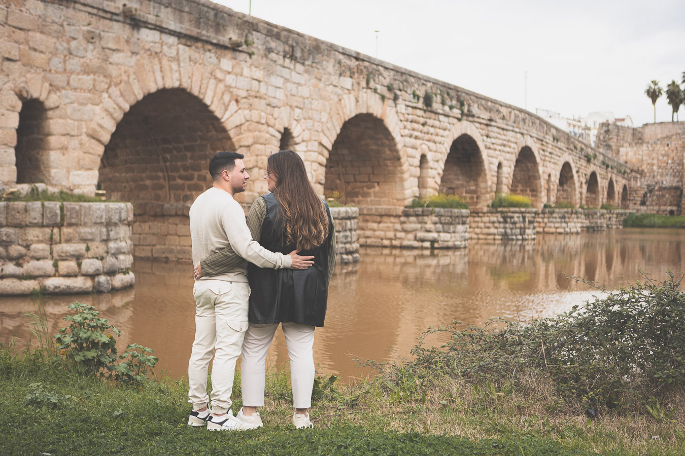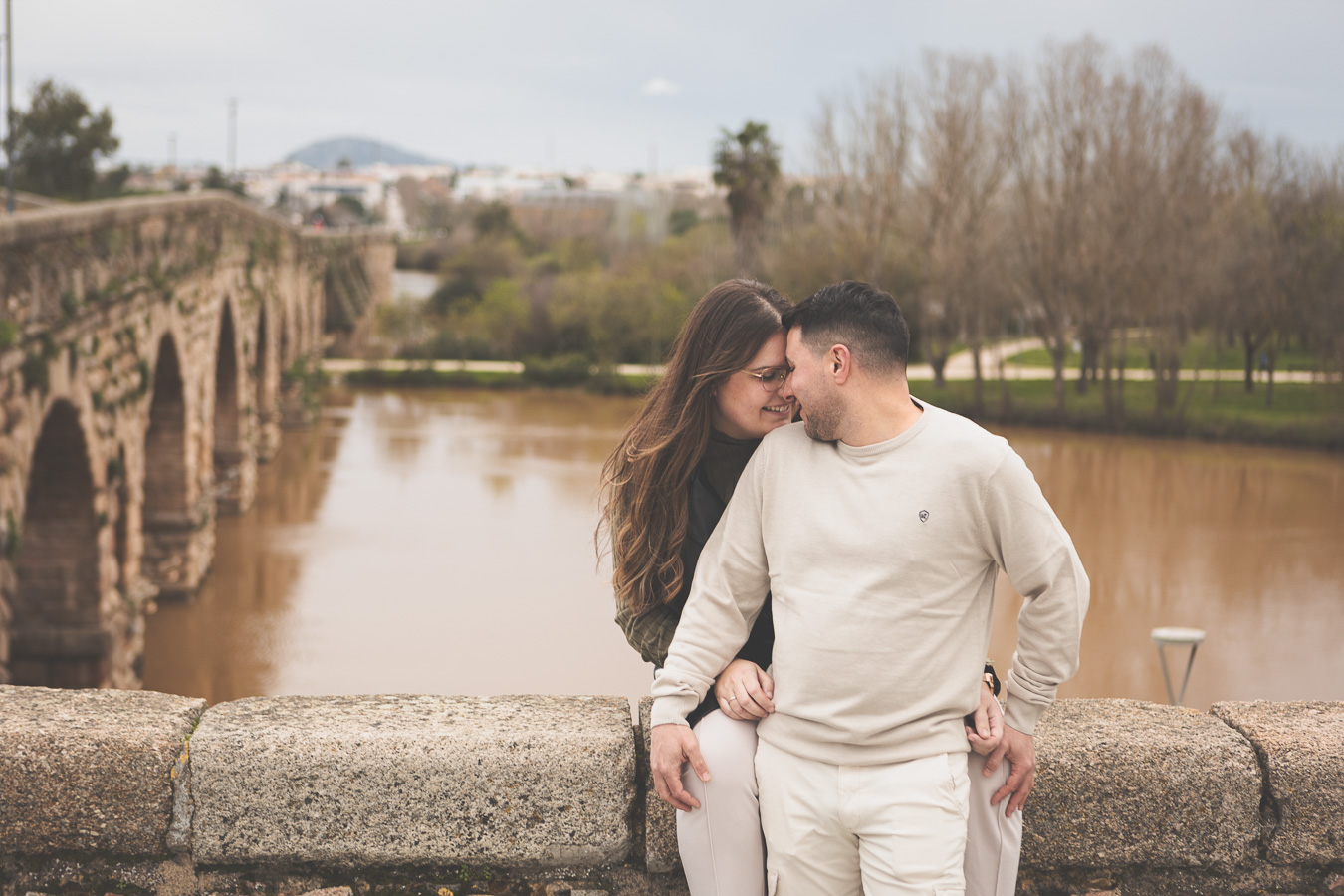 El día amaneció con un cielo encapotado y amenaza de lluvia, pero lejos de desanimarnos, aprovechamos la luz suave y el ambiente melancólico para darle un toque especial a la sesión. Comenzamos el recorrido en el Puente Romano, con el Guadiana reflejando la tenue claridad del cielo y regalándonos un escenario perfecto para capturar su complicidad. Entre miradas, risas y gestos espontáneos, cada imagen reflejaba la naturalidad y el cariño que los une. Las antiguas piedras del puente, que han resistido el paso del tiempo, parecían una hermosa metáfora de su relación.