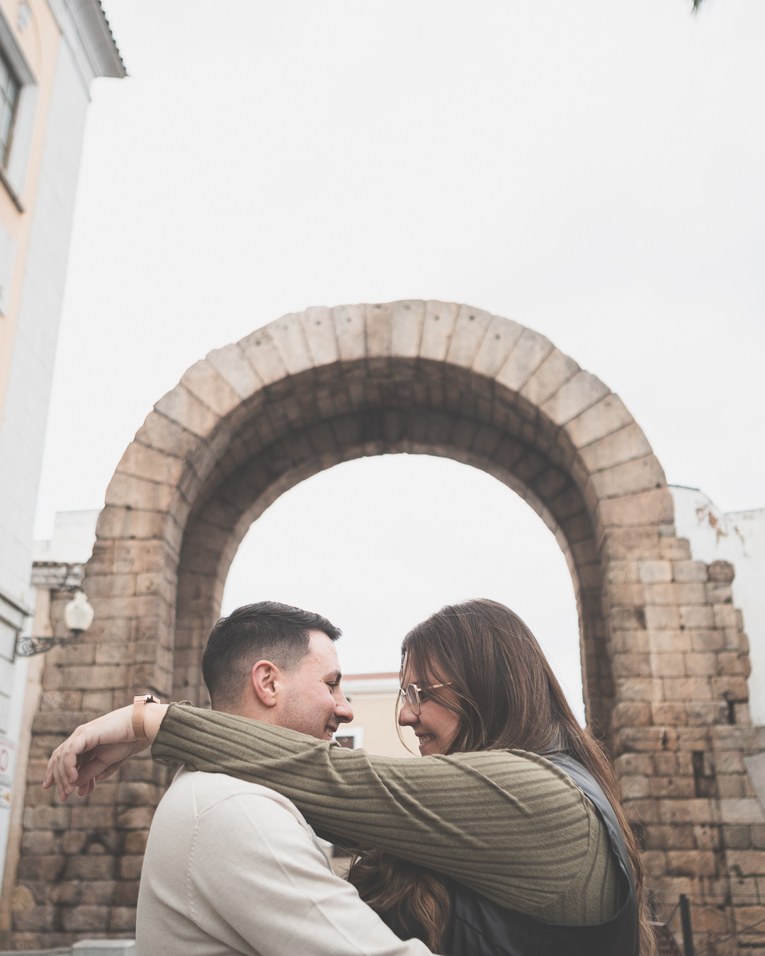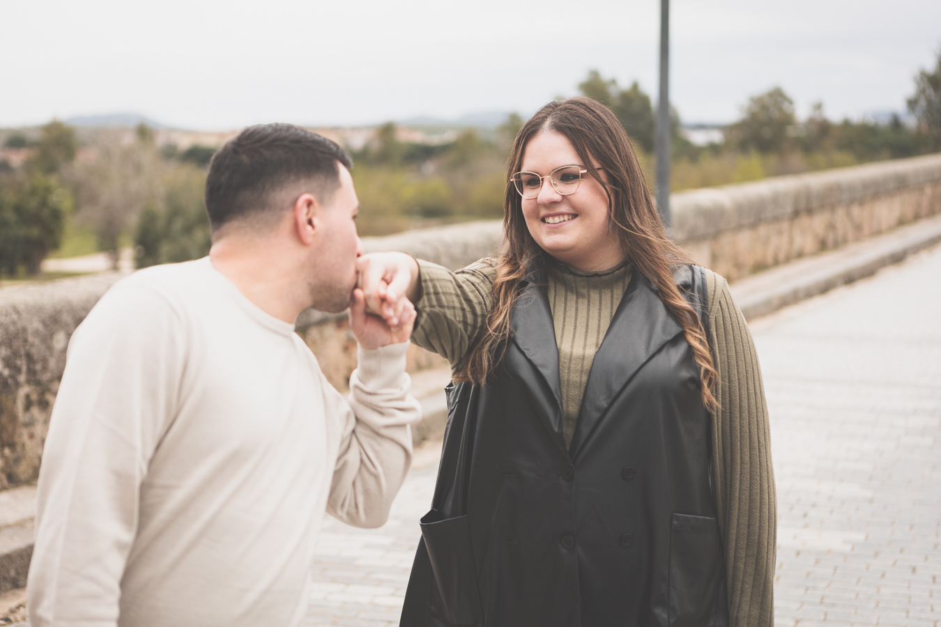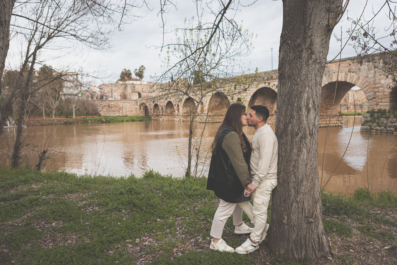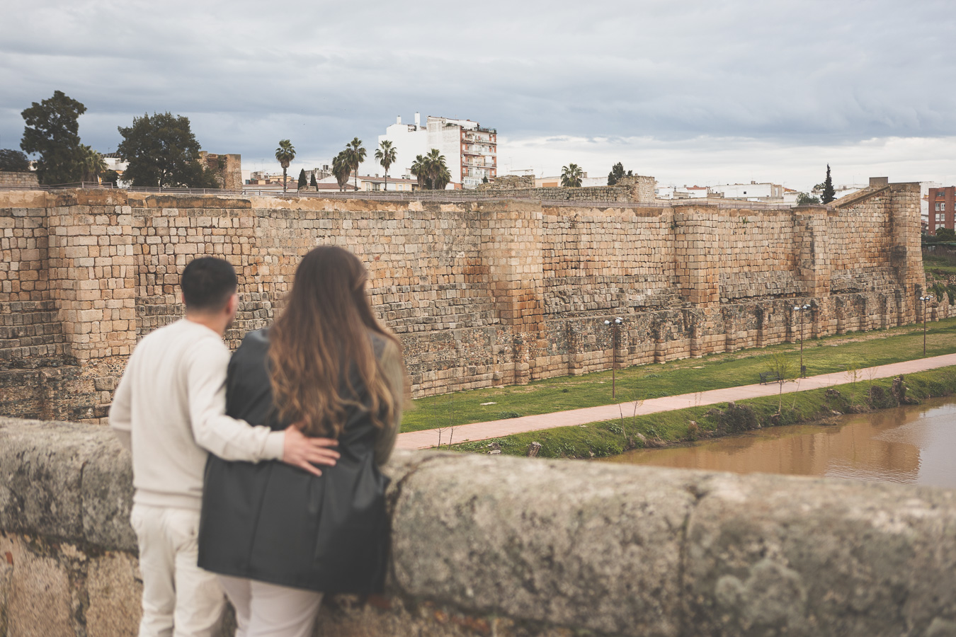 El día amaneció con un cielo encapotado y amenaza de lluvia, pero lejos de desanimarnos, aprovechamos la luz suave y el ambiente melancólico para darle un toque especial a la sesión. Comenzamos el recorrido en el Puente Romano, con el Guadiana reflejando la tenue claridad del cielo y regalándonos un escenario perfecto para capturar su complicidad. Entre miradas, risas y gestos espontáneos, cada imagen reflejaba la naturalidad y el cariño que los une. Las antiguas piedras del puente, que han resistido el paso del tiempo, parecían una hermosa metáfora de su relación.