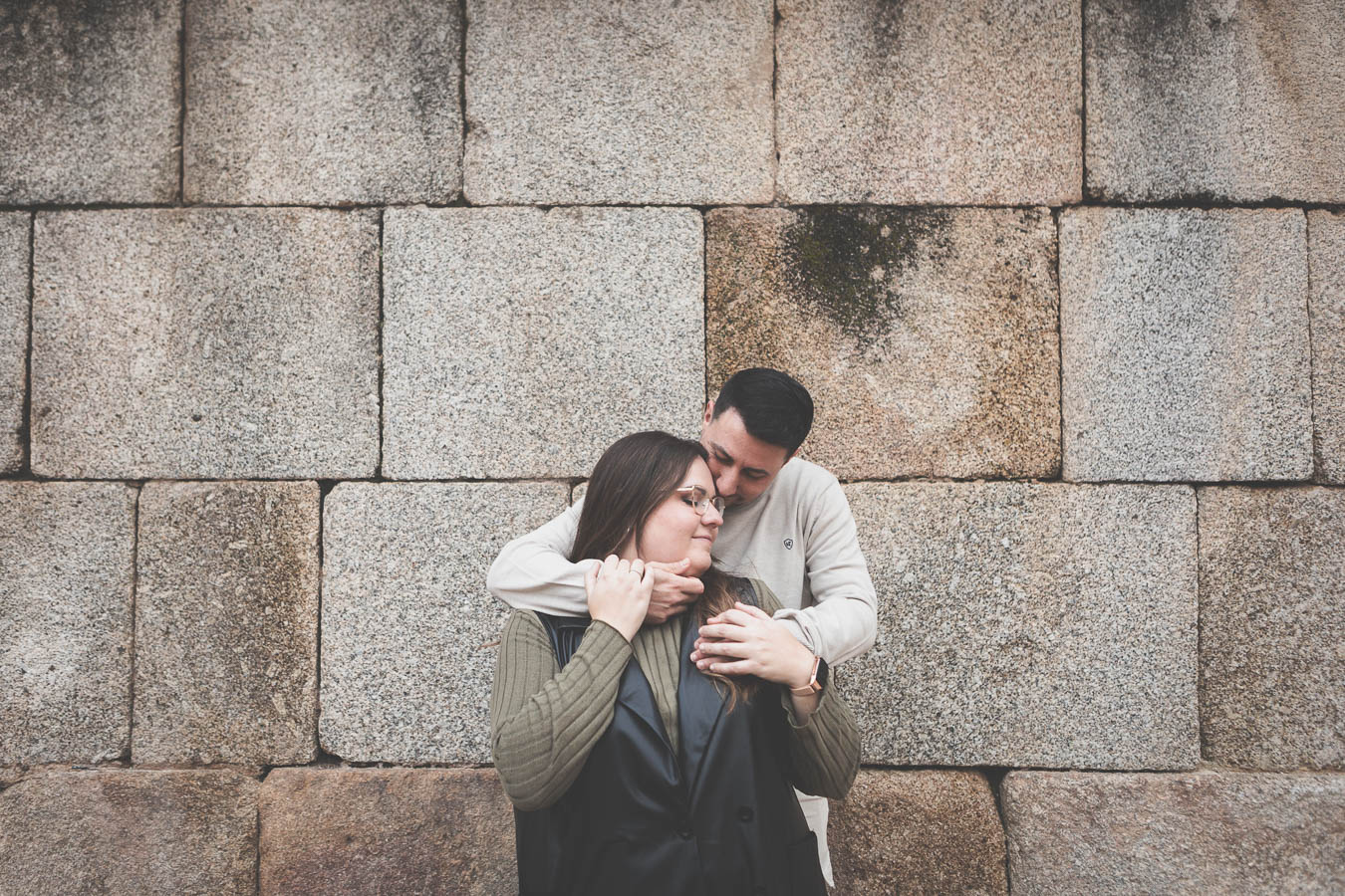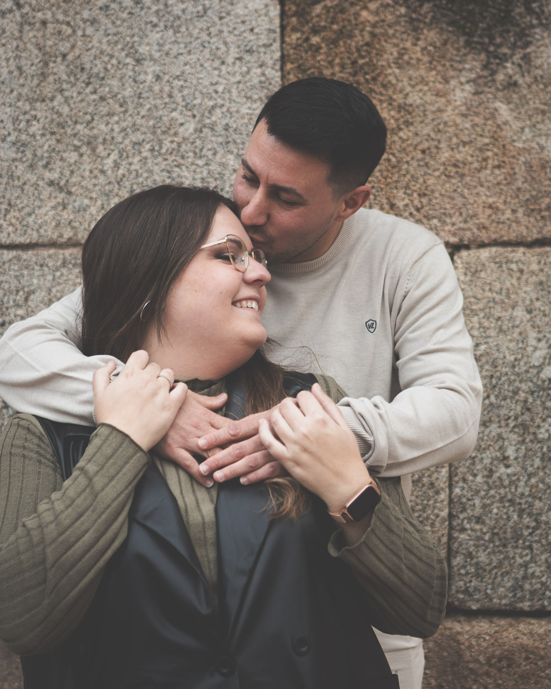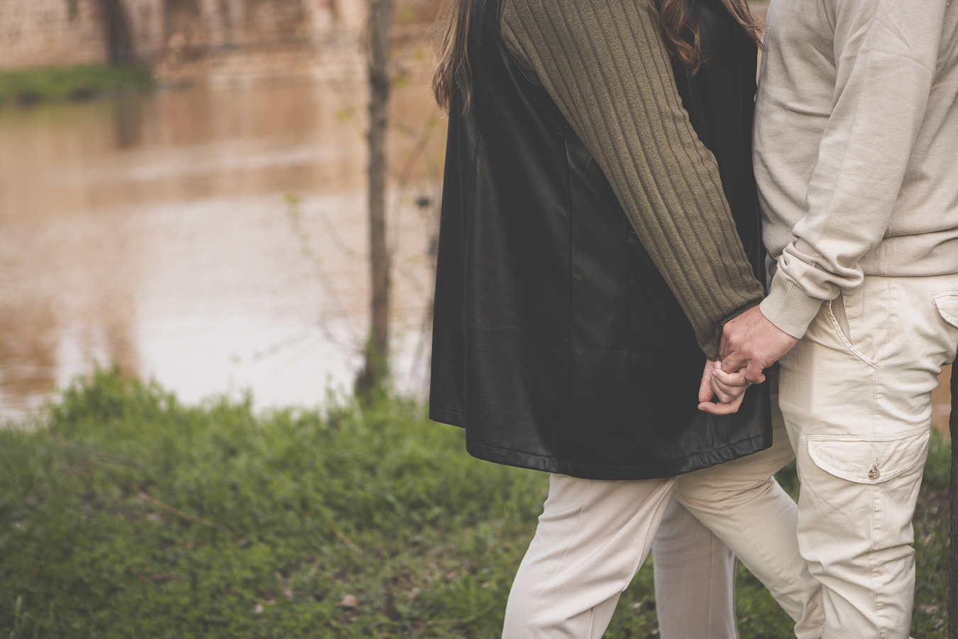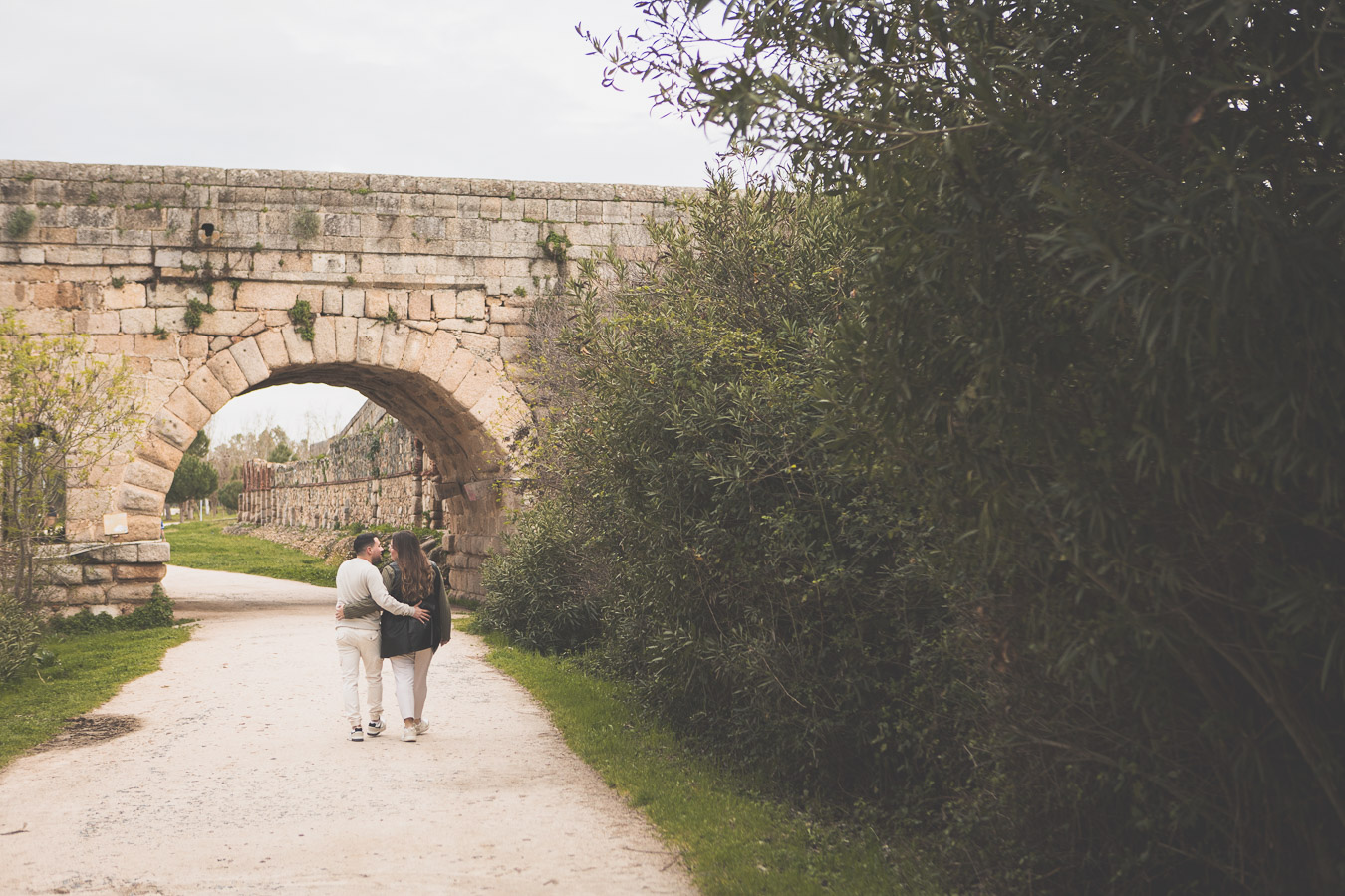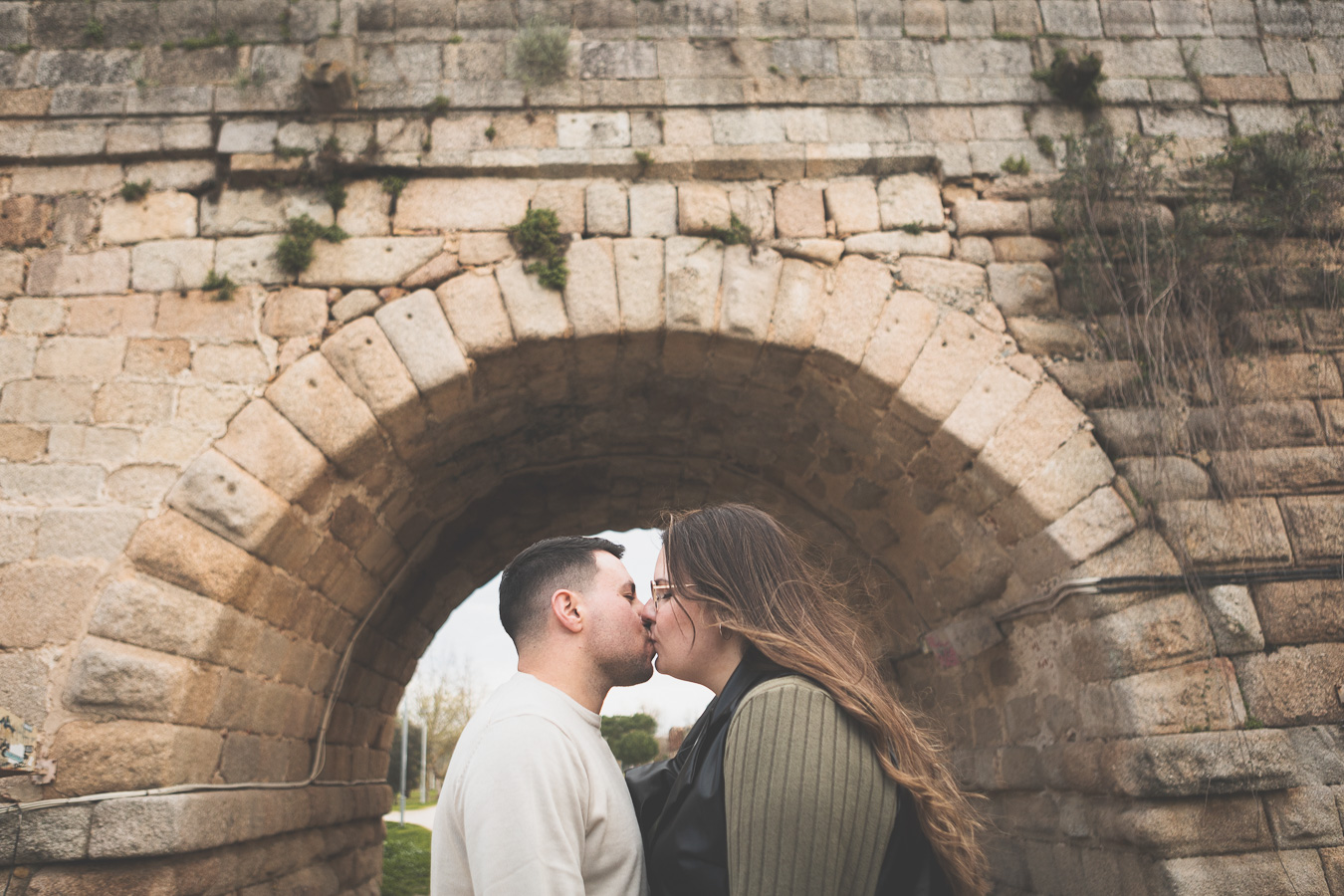 El día amaneció con un cielo encapotado y amenaza de lluvia, pero lejos de desanimarnos, aprovechamos la luz suave y el ambiente melancólico para darle un toque especial a la sesión. Comenzamos el recorrido en el Puente Romano, con el Guadiana reflejando la tenue claridad del cielo y regalándonos un escenario perfecto para capturar su complicidad. Entre miradas, risas y gestos espontáneos, cada imagen reflejaba la naturalidad y el cariño que los une. Las antiguas piedras del puente, que han resistido el paso del tiempo, parecían una hermosa metáfora de su relación.