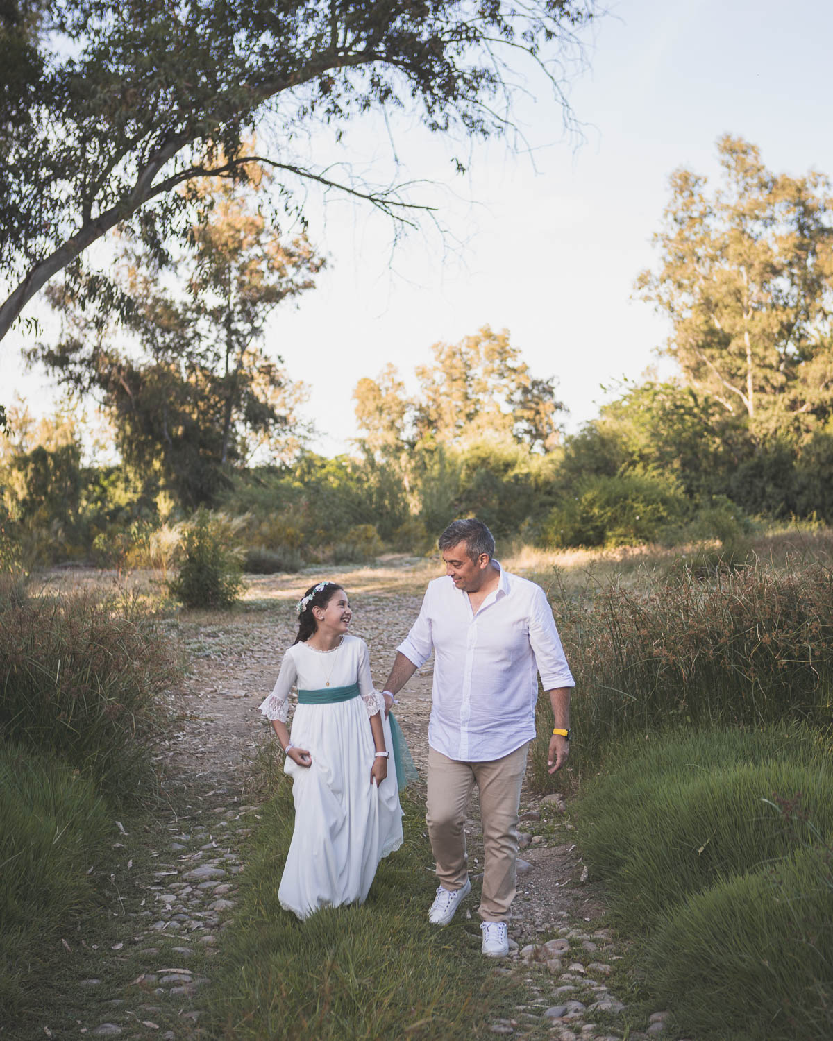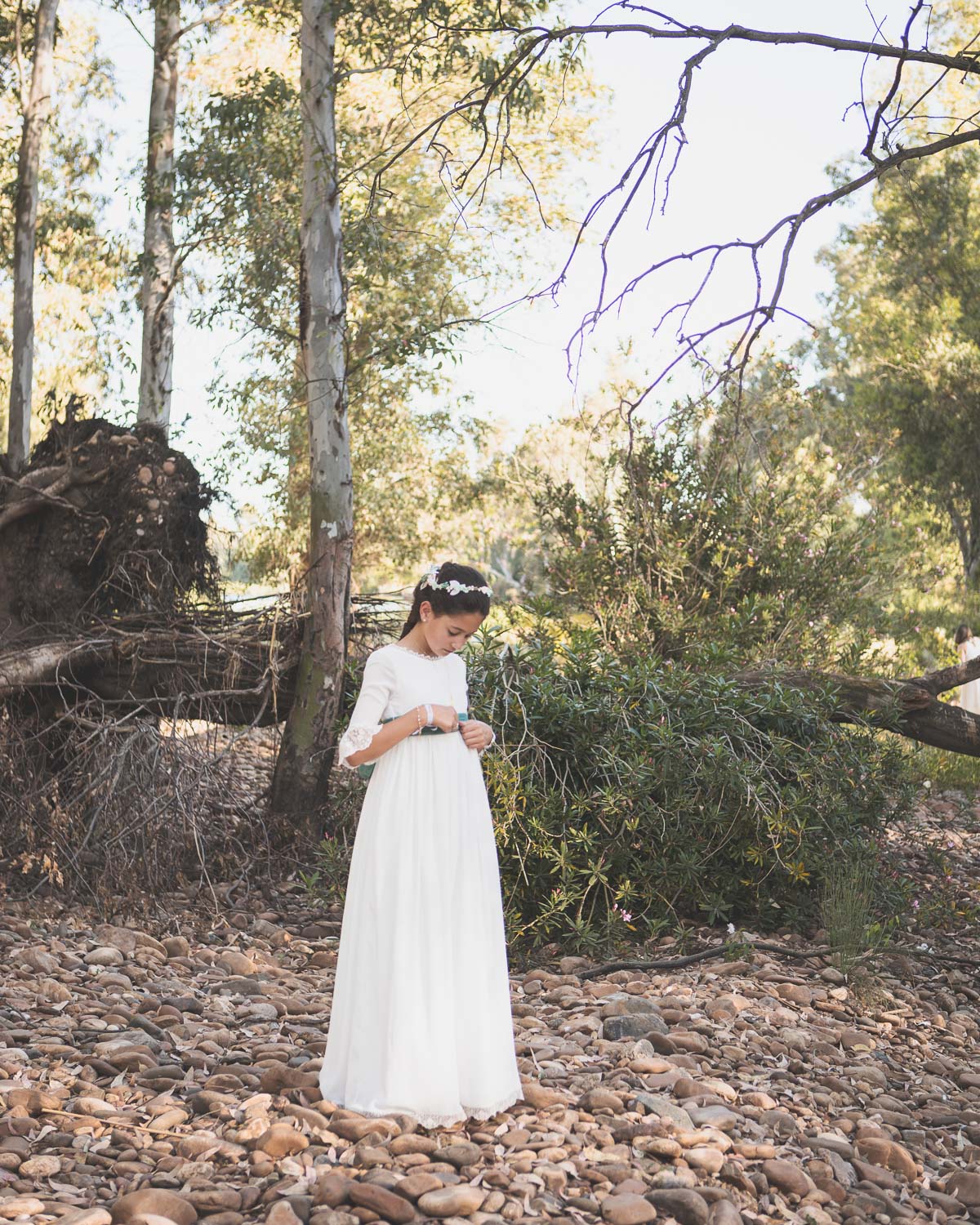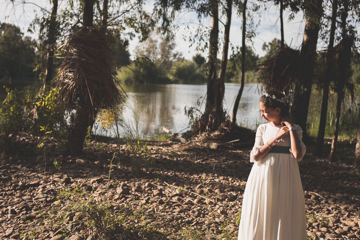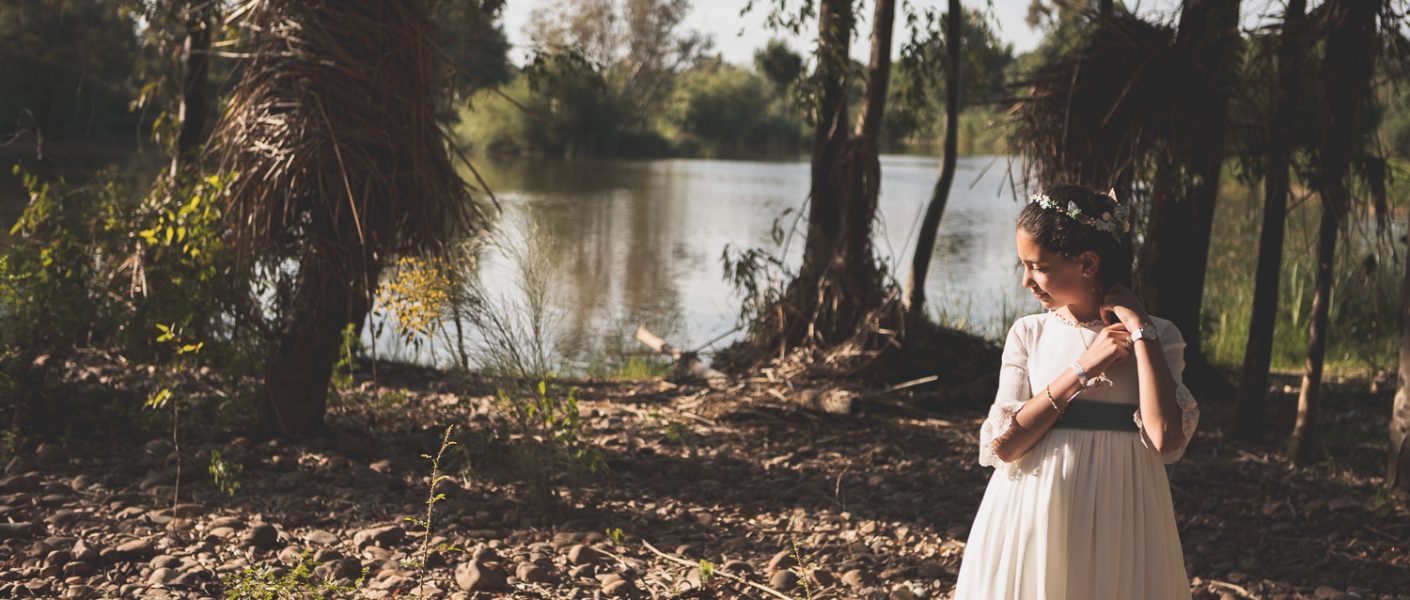 Elegimos la Fábrica de la Luz, un rincón precioso junto al río Guadiana, rodeado de árboles y con el sonido del agua de fondo. El entorno no podía ser más perfecto para una niña tan viva y natural.