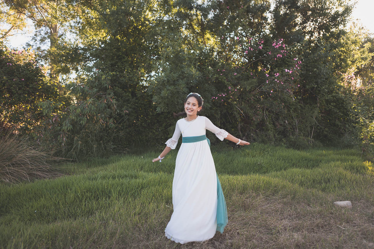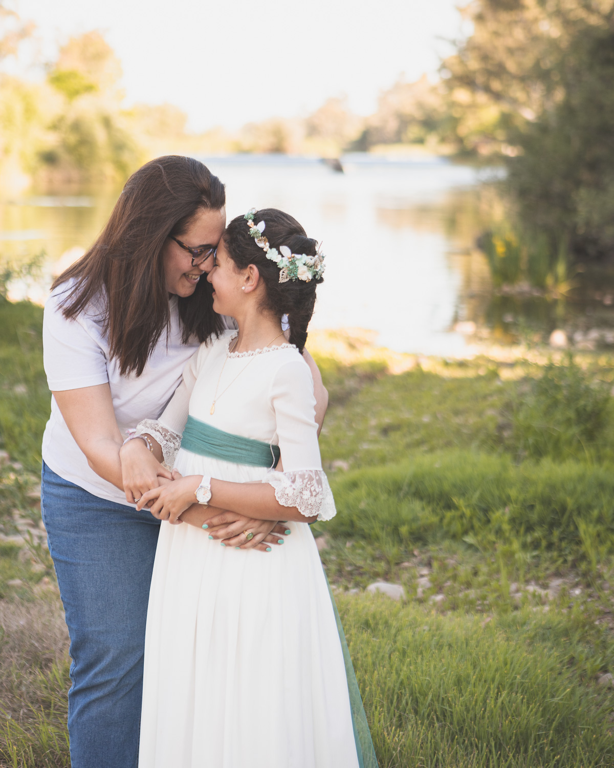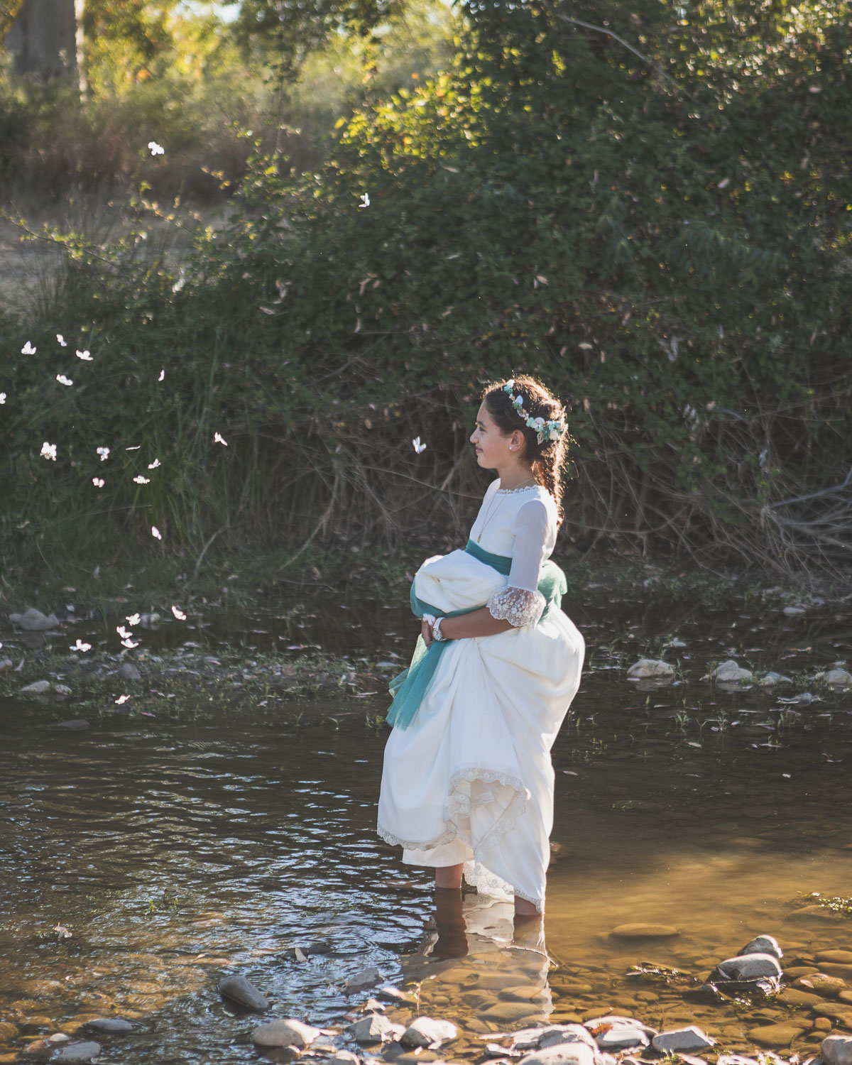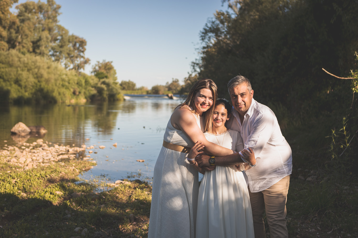 Elegimos la Fábrica de la Luz, un rincón precioso junto al río Guadiana, rodeado de árboles y con el sonido del agua de fondo. El entorno no podía ser más perfecto para una niña tan viva y natural.