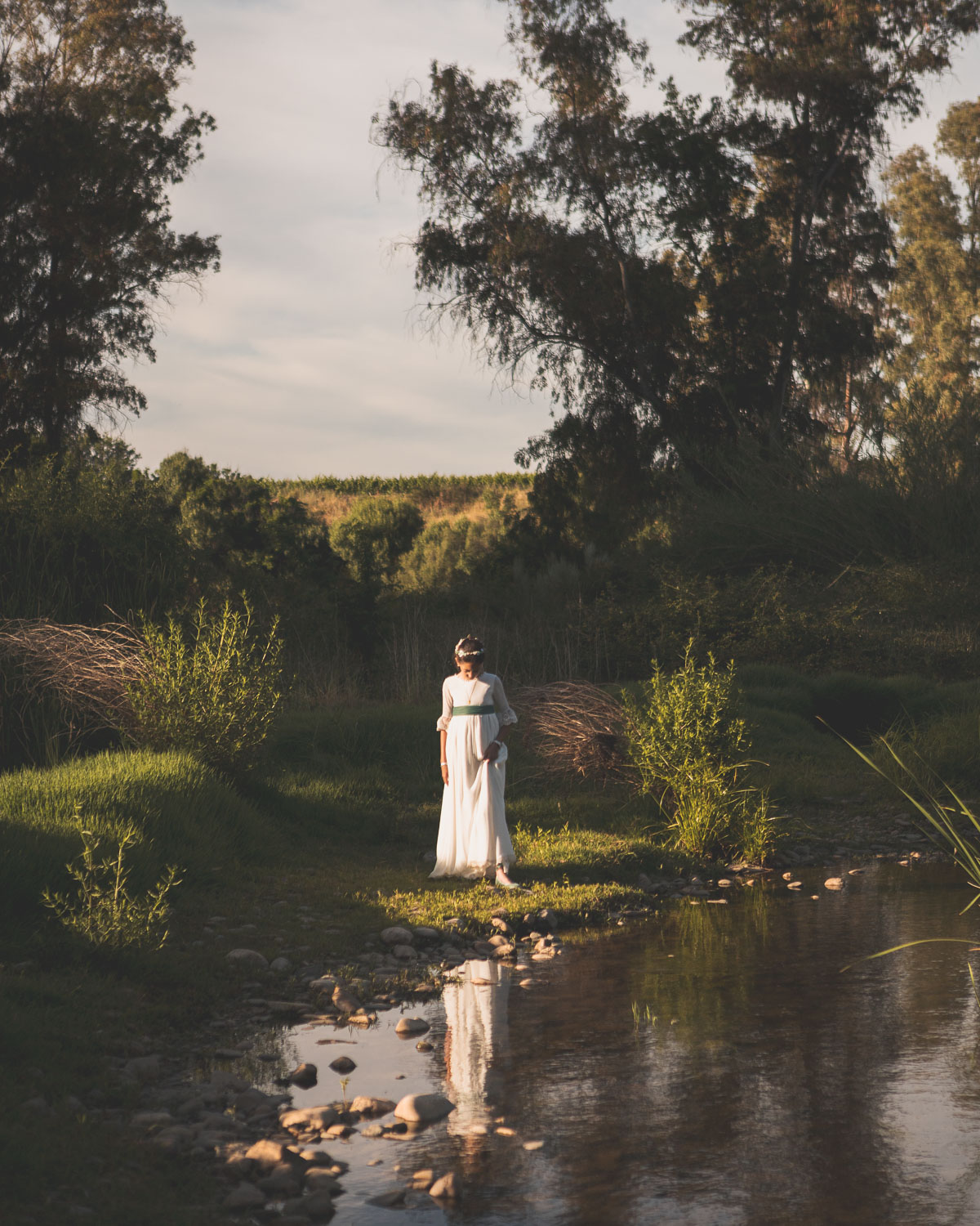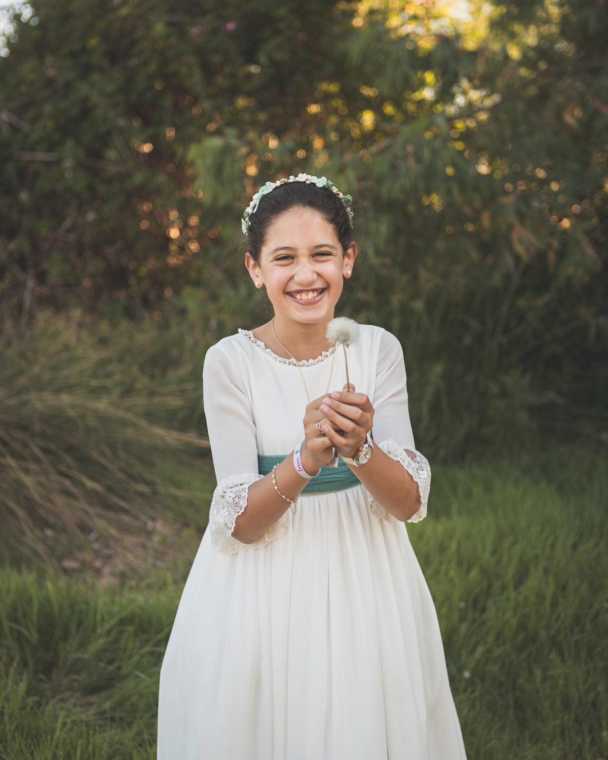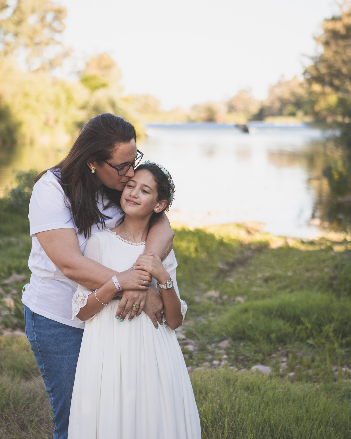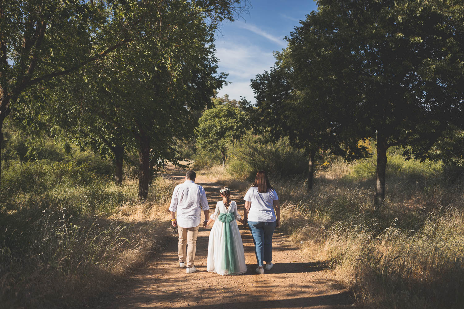 Elegimos la Fábrica de la Luz, un rincón precioso junto al río Guadiana, rodeado de árboles y con el sonido del agua de fondo. El entorno no podía ser más perfecto para una niña tan viva y natural.