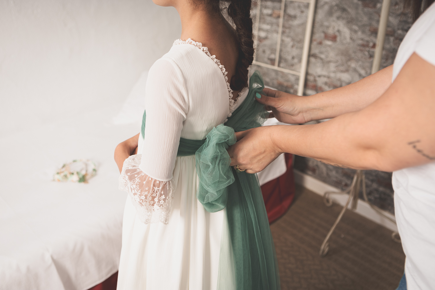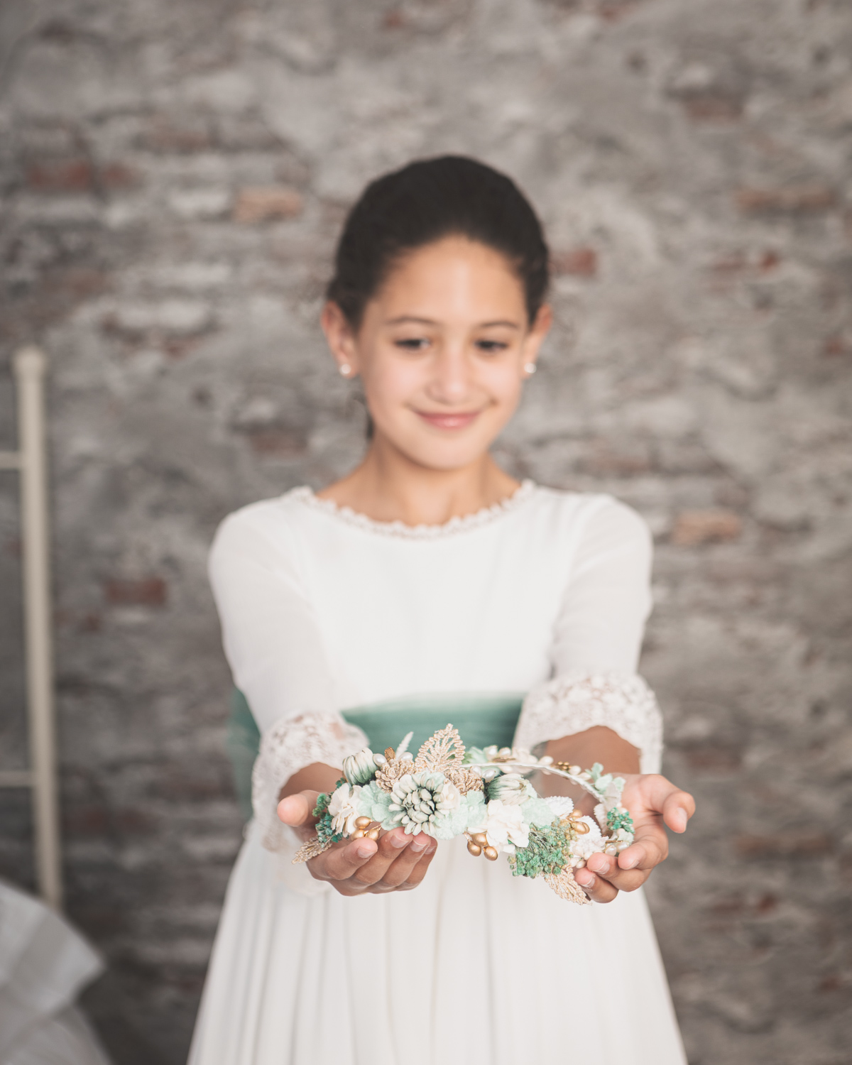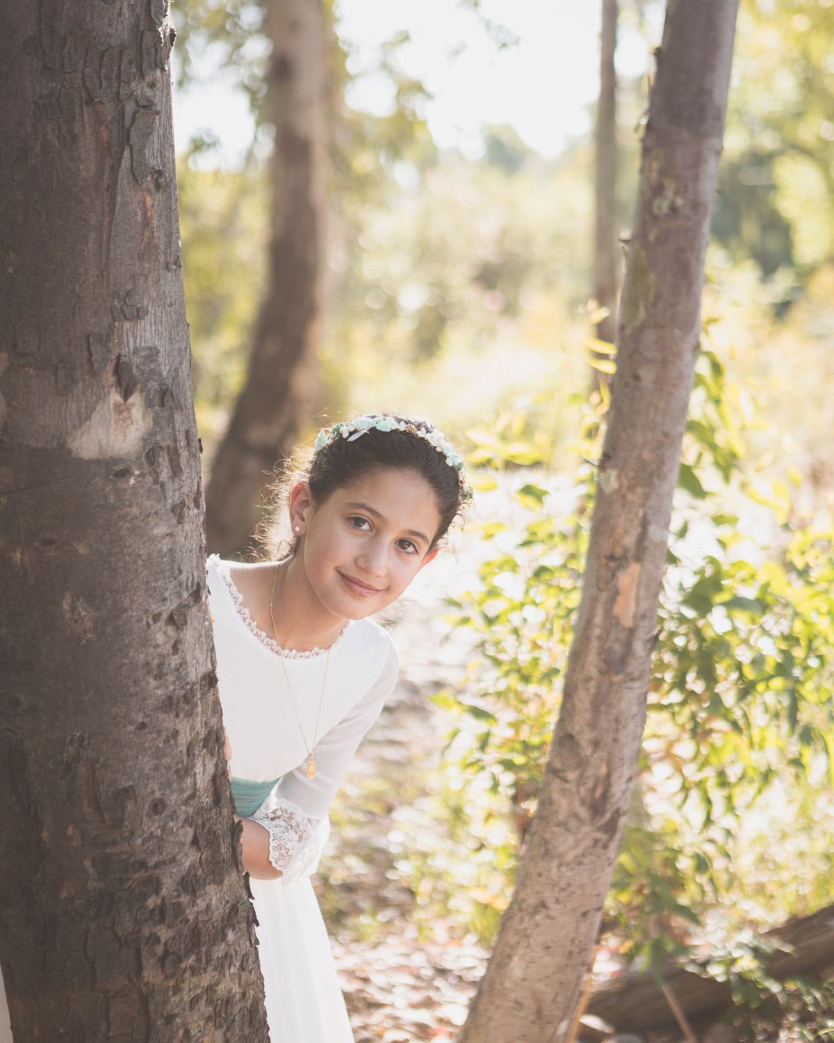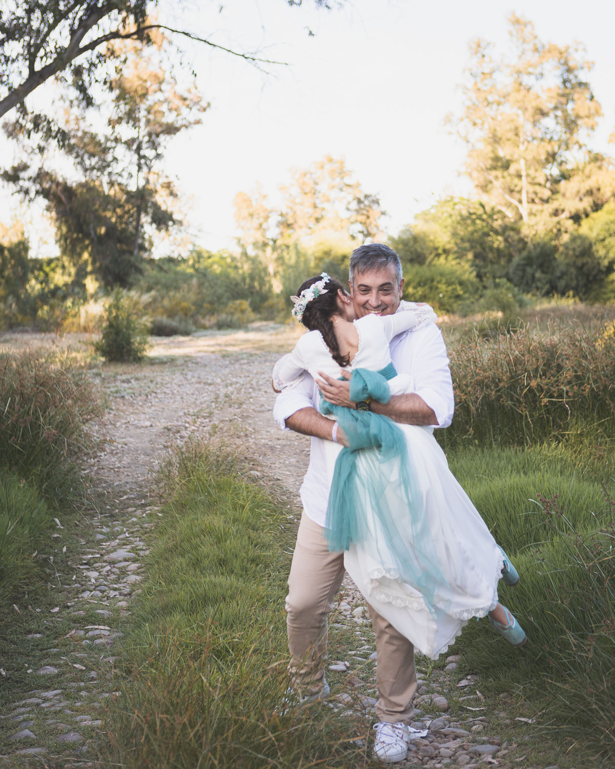 Elegimos la Fábrica de la Luz, un rincón precioso junto al río Guadiana, rodeado de árboles y con el sonido del agua de fondo. El entorno no podía ser más perfecto para una niña tan viva y natural.